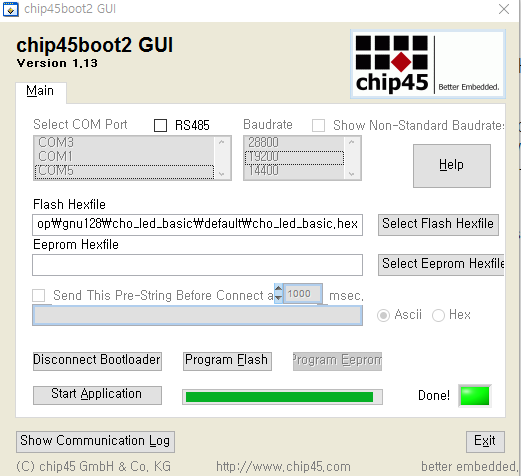 - 개발된_응용_프로그램 .hex이 정상으로 Write 된 것을 확인 한 다음(Program 진행 상태 창을 확인), Disconnect to Bootloader 탭을 눌러서 AVR Embedded System 과 chip45boot2 GUI 프로그램의 통신 상태를 종료 한다.