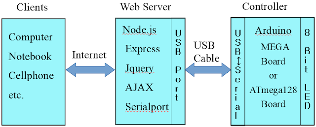 - 아래 프로그램은 Web browser로 부터 Checkbox의 상태를 전송 받아 Serial 통신을 이용 하여 Controller에 전송 하고, Controller 측 LED의 상태를 Serial 통신을 이용 하여 전송 받아 원격지에 있는 Web browser에 전송 한다.